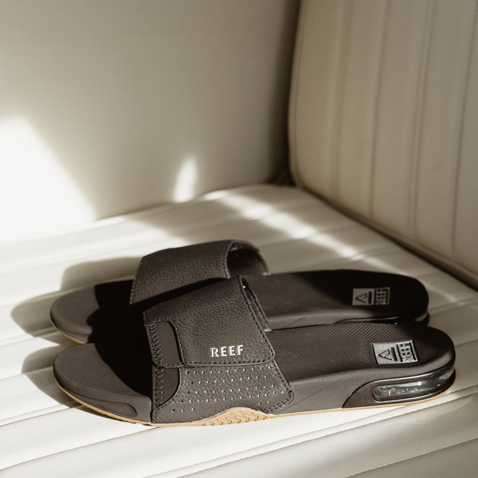 100% Fanning. 100% slide. 100% Reef. The Fanning slide is 300% awesome. With everything that makes the Fanning our bestselling men’s shoe. including the crucial built-in bottle opener. Now styled as an easy on. easy off. easy everything slide. 100% do it.
