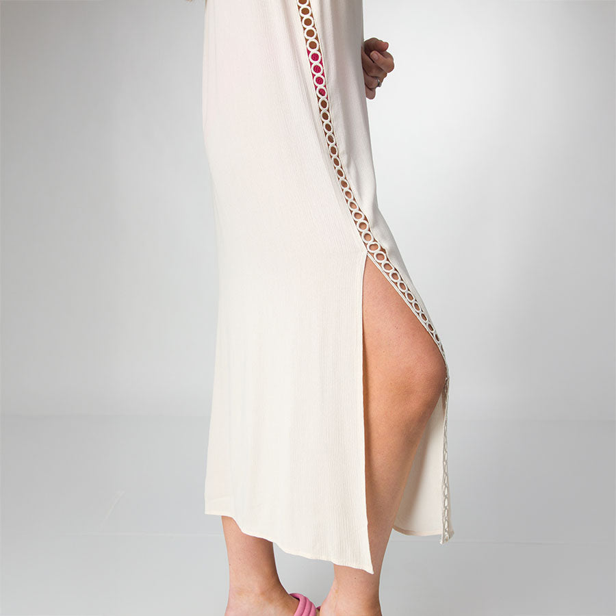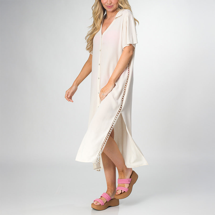 A lightweight button-up with flutter sleeves. perfect for seaside relaxation. Our Irina shirt dress features peek-a-boo crochet trim at the sides. and fully functional buttons in front. Wear it buttoned up as a coverup dress. or unbuttoned as a kimono. This relaxed fit is your effortless go-to for those sun-kissed days.