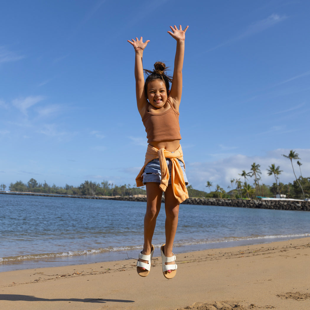 Introducing the new Little Ojai Sunstroll. so your kiddo can look as good as you do. Inspired by our Ojai Two Bar. this premium sandal is made with sustainably-sourced suede and a soft jersey lining for instant comfort. We added an elasticized back strap for a secure and adaptive fit.